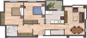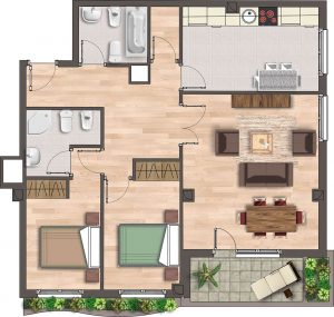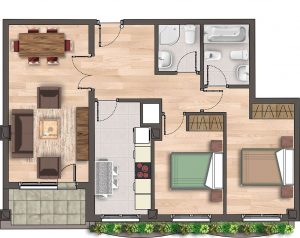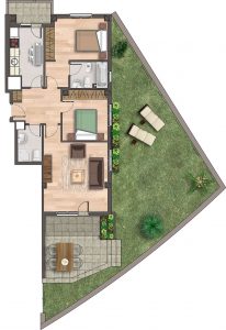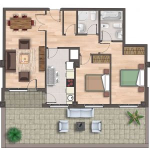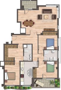 • Mueble suspendido bajo lavabo con dos cajones compartimentados en al menos un baño de la vivienda y lavabo con semipedestal en el resto.