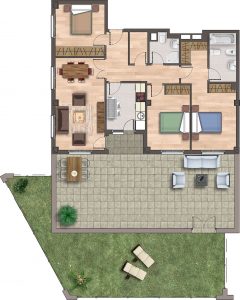 • Carpintería exterior en Aluminio gris antracita RAL 7016 con rotura de puente térmico, puertas de acceso a terrazas totalmente acristaladas.